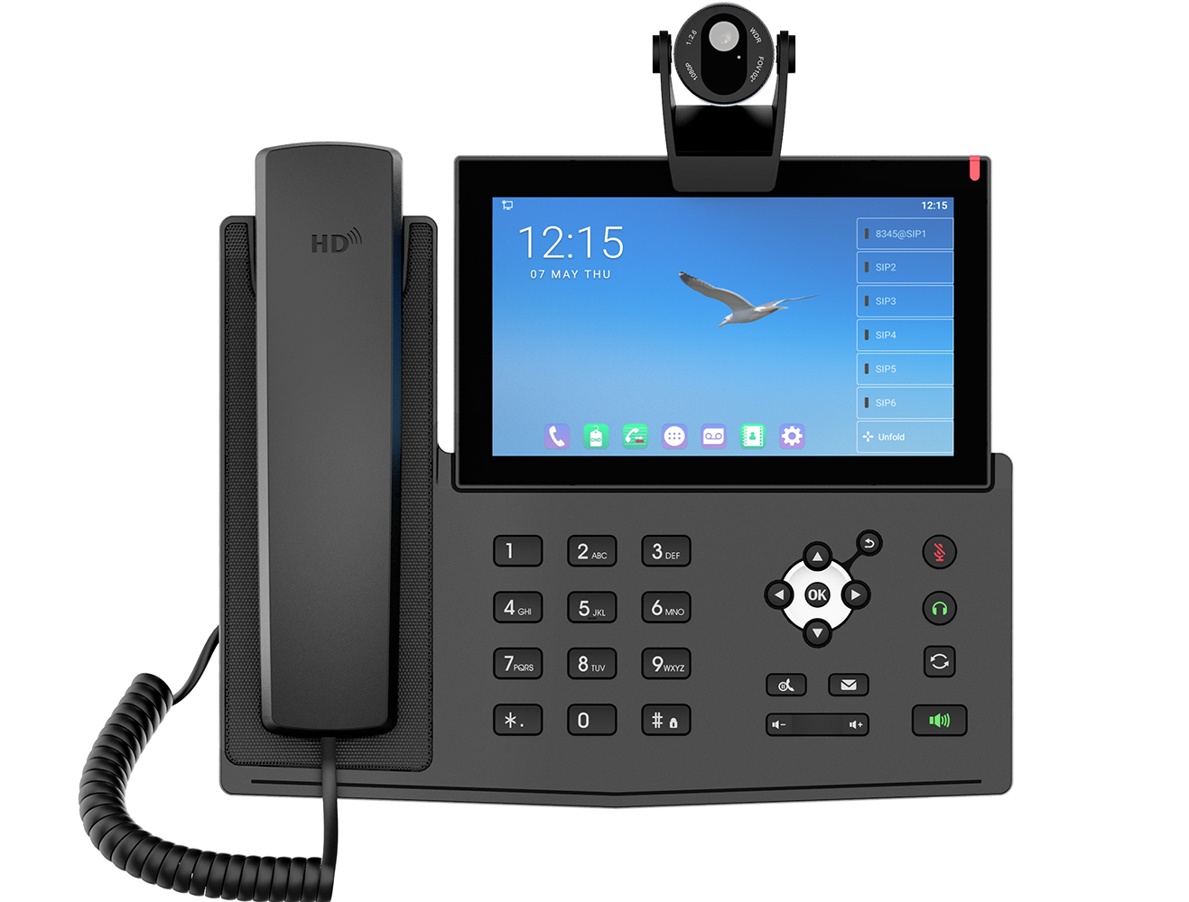 It is a high-end Android IP phone with a built-in camera, designed for video calls, executive offices, and professional VoIP communication.
